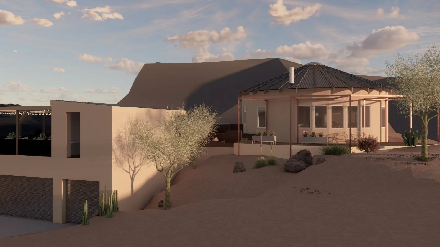 To prioritize the landscape over the building, the owners decided to cut down on building costs, hence refurbishing an existing garage and opting for a pre-fabricated yurt, with a white stucco finish.